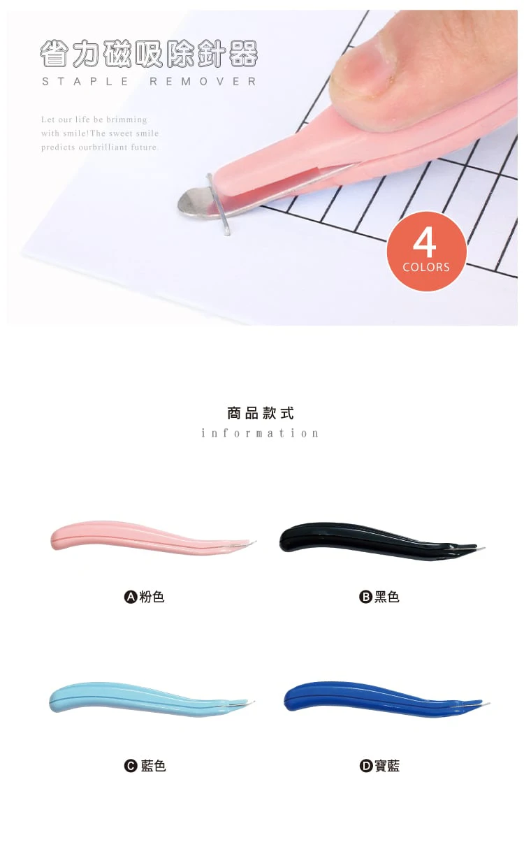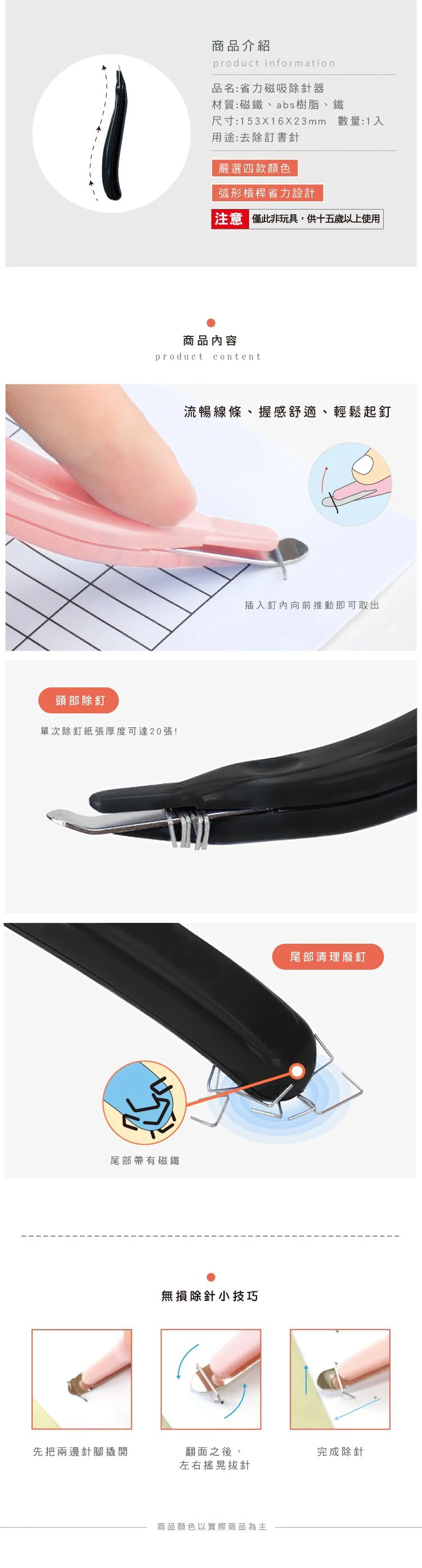 3. 弧形槓桿省力設計,辦公室除釘好幫手 4. 尾部磁吸設計,輕鬆清理廢釘