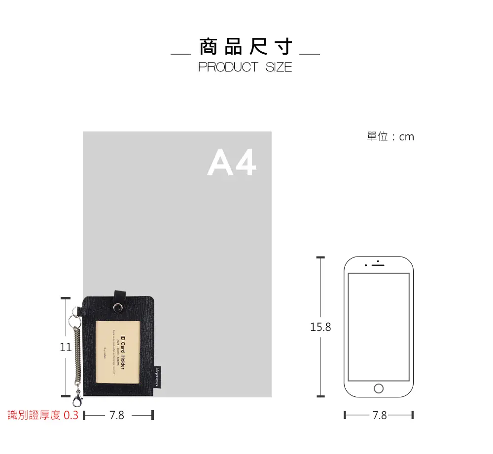 - 尺寸:票卡夾:11x7.5cm/彈簧扣:5.5cm