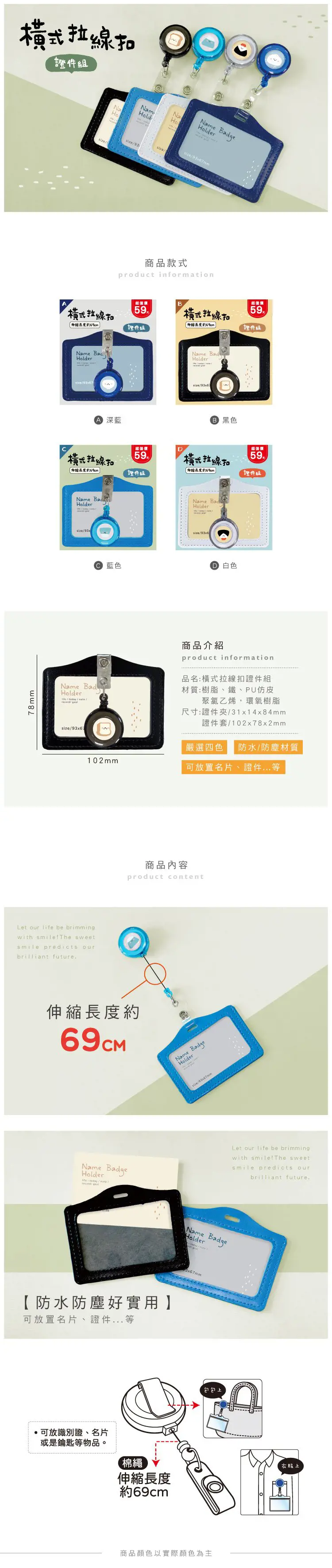 【商品說明】 1. 青青 小呸角系列 CZ-909 橫式拉線扣證件組(證件夾:31x14x84mm/證件套:102x78x2mm) 2. 防水、防塵