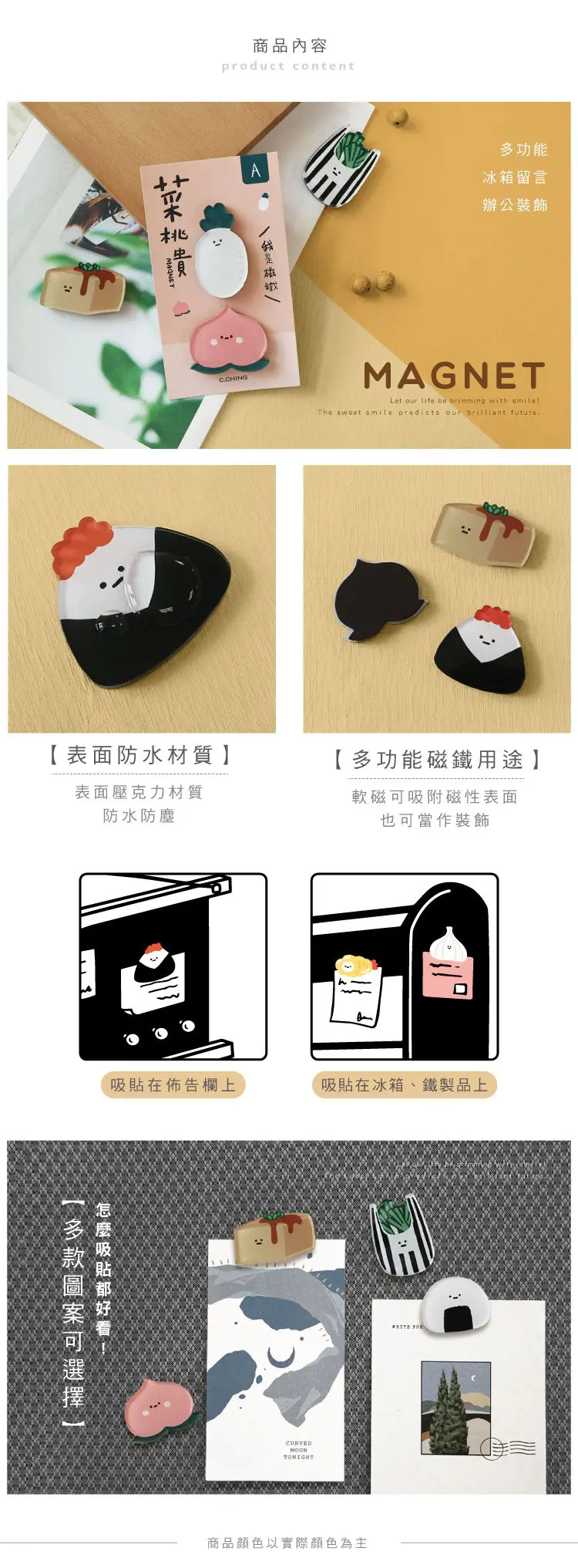 1.青青 簡單生活系列 CGC-338 小呸角創意磁鐵2入 (A.菜頭43x24x5、桃子37x32x5mm/B.鮭魚卵飯糰36x33x5、飯糰君36x29x5mm C.炸蝦42x24x5、臭豆腐39x25x5mm/D.大蒜37x35x5、裝蒜君40x29x5mm)