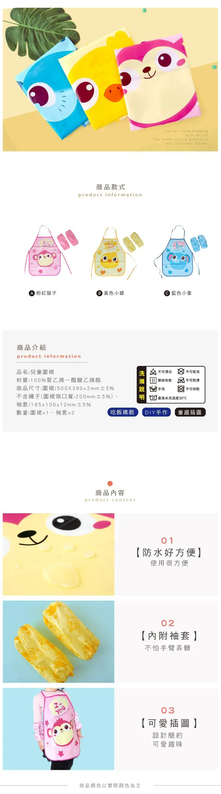 【商品說明】 1.青青 簡單生活系列 CZ-916 兒童圍裙(圍裙/500X390x2mm±5%不含繩子(圍裙領口寬:200mm±5%)、袖套/185x100x12mm±5%