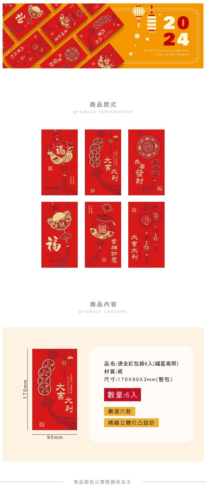 ◎青青 節慶系列 CP-357 燙金紅包袋6入(福星高照)(整包/170X90X3mm)