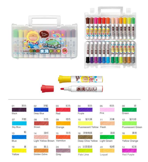 水洗彩色筆採用可水洗無毒顏料,如果不小心畫到皮膚、衣服、床單等等,只要用清水、肥皂或一般洗衣劑就能輕鬆洗淨,怎麼畫都不怕弄髒喔!