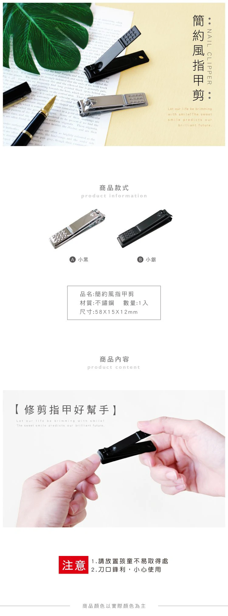 【商品說明】 1. 青青 簡單生活系列 CZ-948 簡約風指甲剪(58X15X12mm) 2. 用途:修剪指甲 3. 注意事項:1.請放置孩童不易取得處 2.刀口鋒利,小心使用