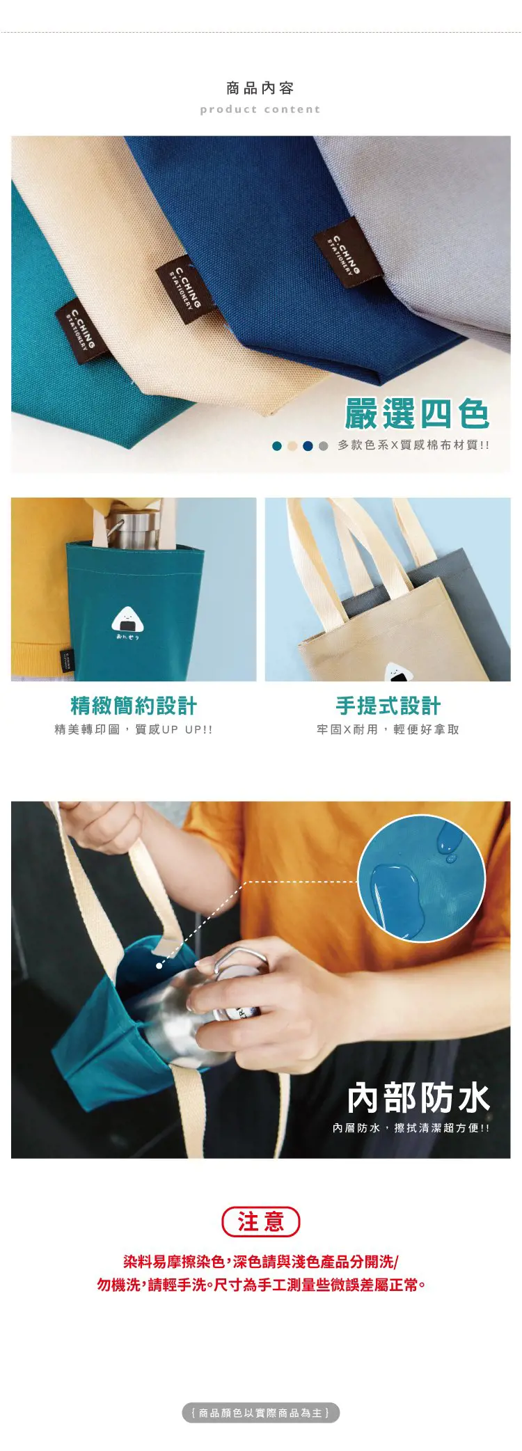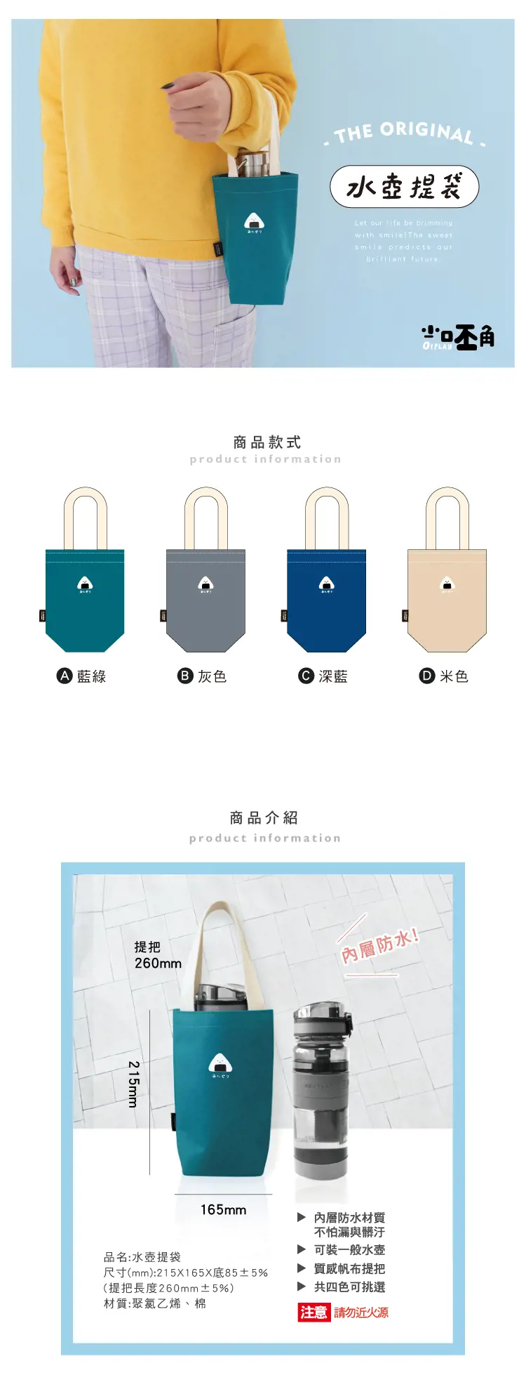 1. 青青 小呸角系列 CBG-593 小呸角水壺提袋 2.尺寸:215X165X底85mm±5%/提把長度260mm±5% 3.貼心手提設計好提拿 4.內層防水材質,擦拭清潔超方便~ 5.嚴選4色 /可裝飲料、水壺....等