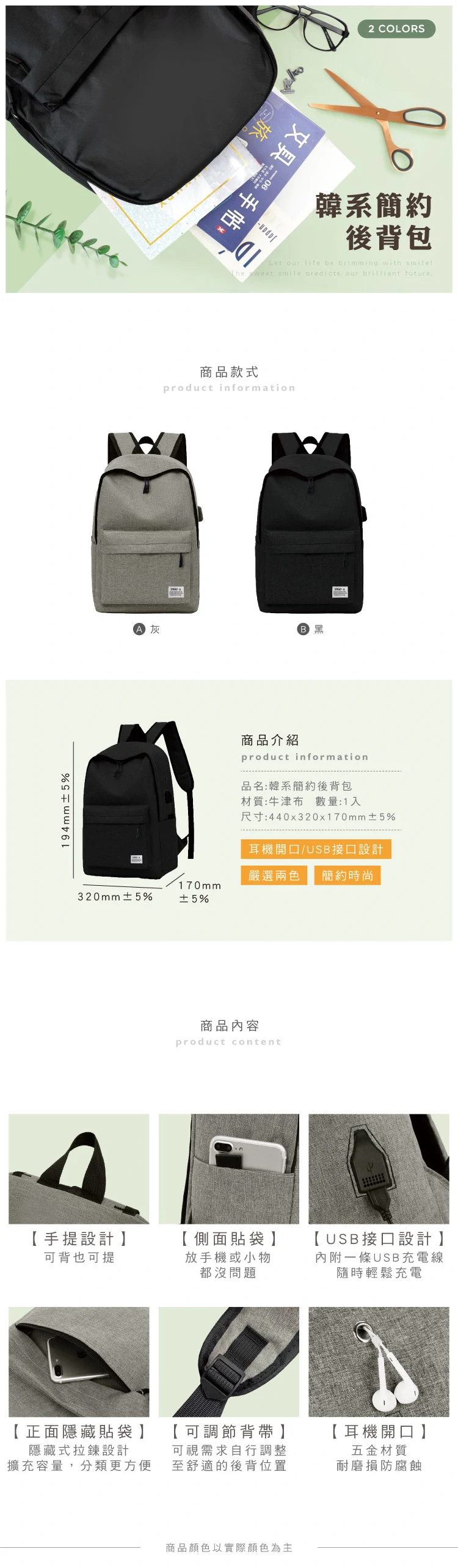 1. 青青 簡單生活系列 CZ-928 韓系簡約後背包(440x320x170mm±5%)