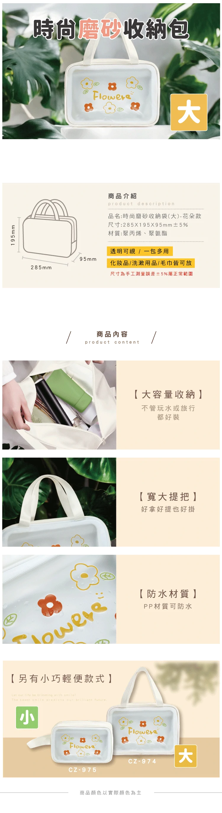 【商品說明】 1.青青 簡單生活系列 CZ-974 時尚磨砂收納袋(大)-花朵款(285x195x95mm±5%)
