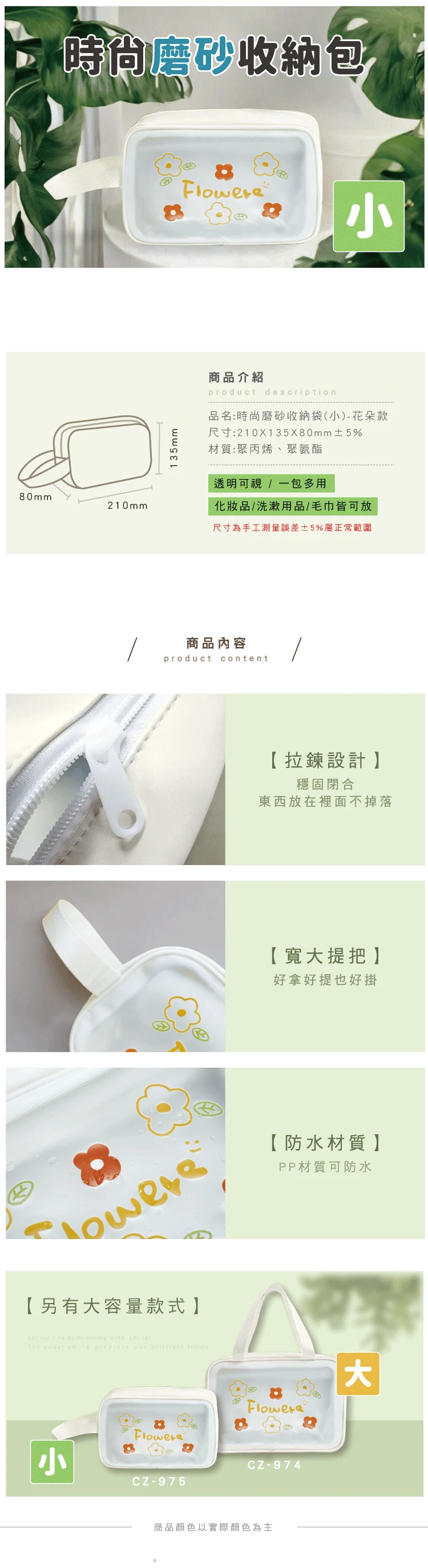 1.青青 簡單生活系列 CZ-975 時尚磨砂收納袋(小)-花朵款(210x135x80mm±5%)