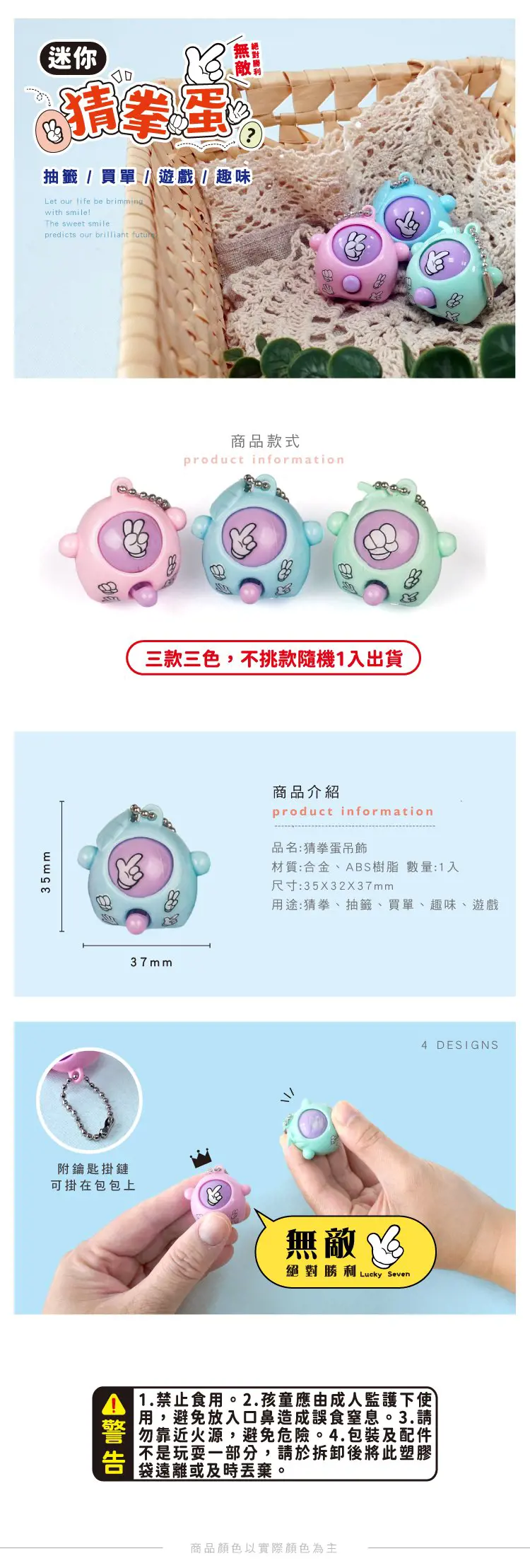 【商品說明】 1. 青青 簡單生活系列 CAE-229 迷你猜拳蛋吊飾(35X32X37mm) 2.多 色可挑選 3. 附贈鑰匙掛鏈可掛在包包喔! 4. 用途:猜拳、裝飾、買單、遊戲