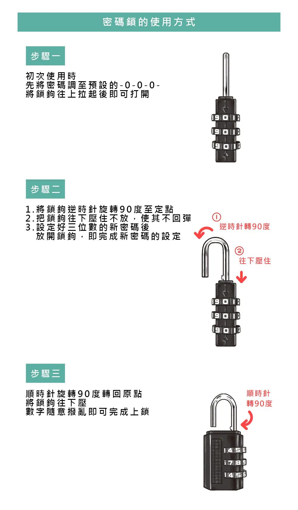 - 可適用於行李箱、鎖櫃、袋包等需要防竊的場合