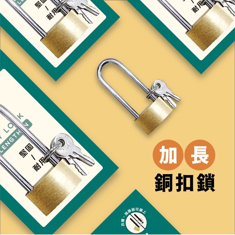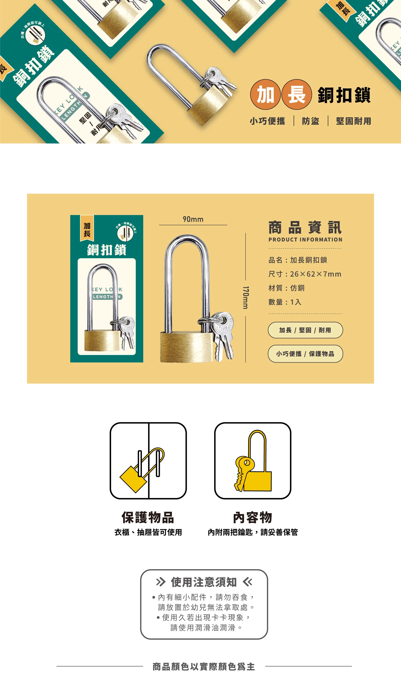 【商品說明】 1. 青青 簡單生活系列    CAE-254 加長銅扣鎖(26X62X7mm) 2.堅固、耐用 3.內容物:鎖X1、鑰匙X2