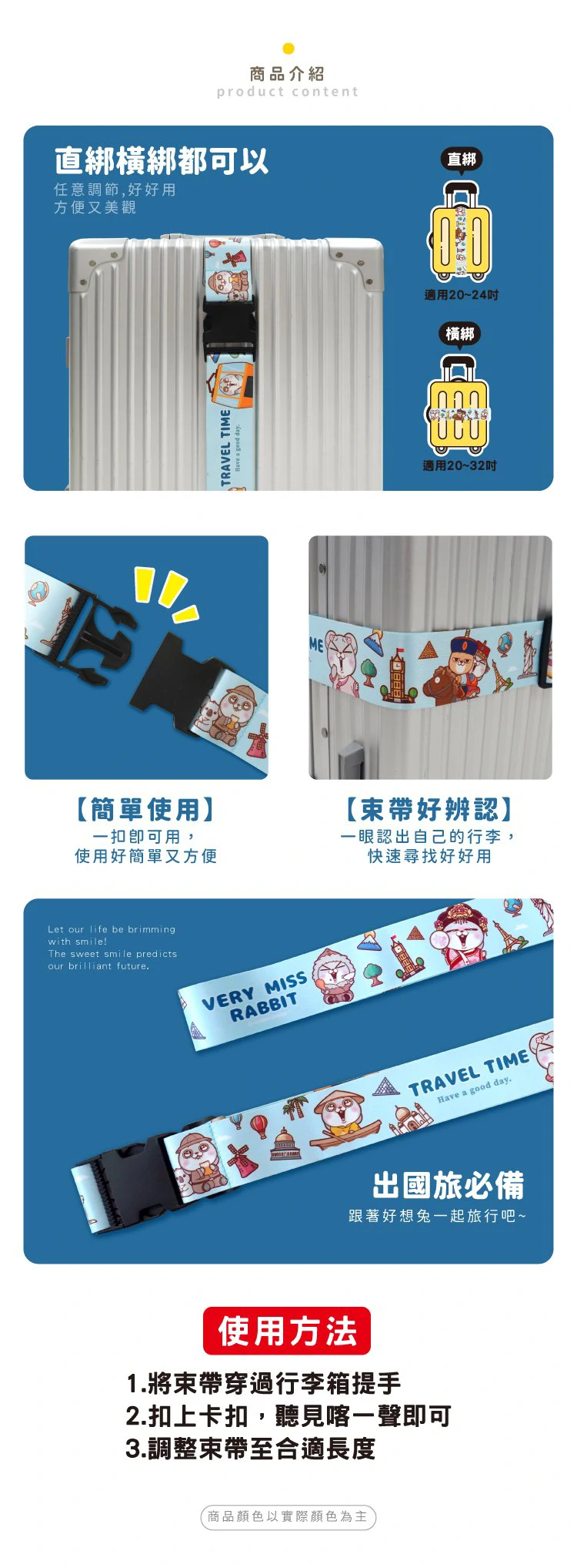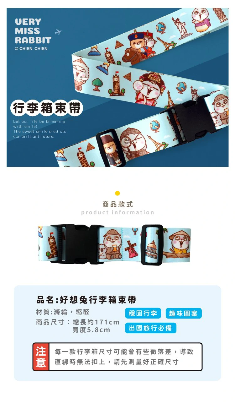 ◎可愛圖案又美觀,出國旅行必備。【商品說明】 1. 青青 好想兔系列 CPW-049 行李箱束帶(總長約171cm/寬度5.8cm)