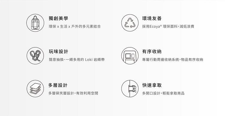 結合環保x生活x戶外的多元素獨創美學。採用Ecoya®環保面料,減低浪費環境友善。一繩多用的Loki岩繩帶,隨意抽換玩味設計。專屬行動週邊收納系統,物品有序收納。多層袋夾層設計,有效利用空間。多開口設計,輕鬆快速拿取商品。