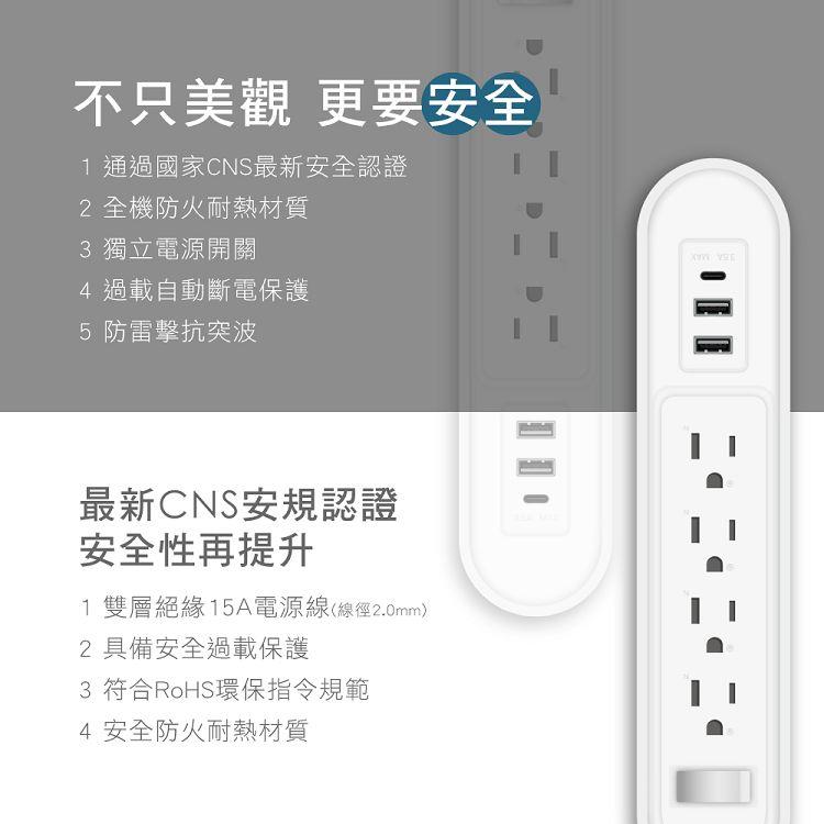 輸出插座:AC 110V, 3孔插座x4、USB插孔x2、Type-C插孔x1