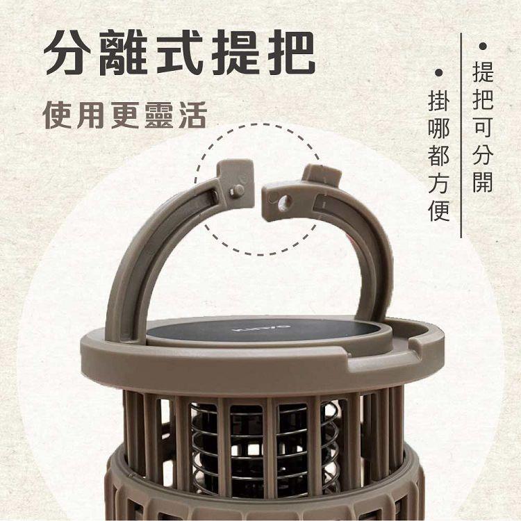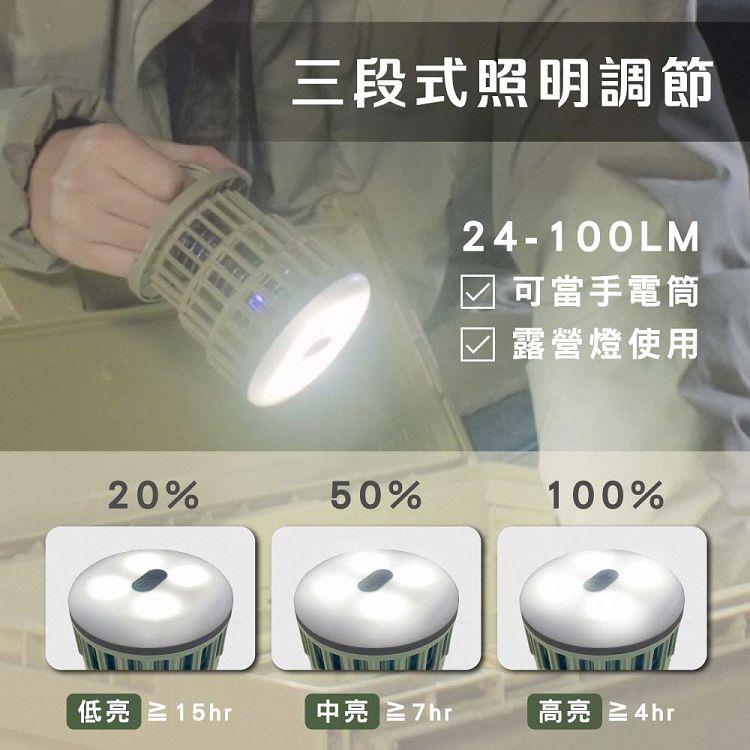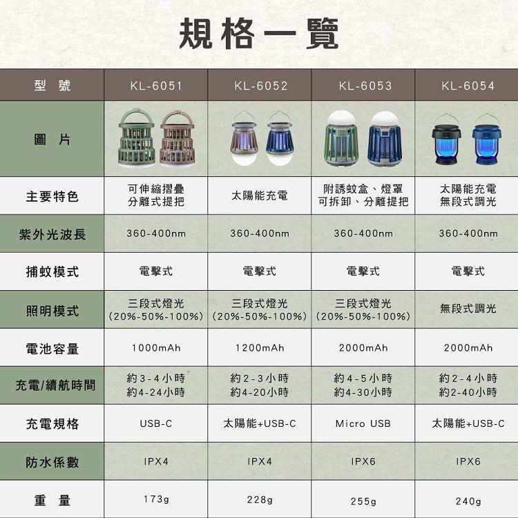 品名:折疊式照明捕蚊兩用燈 型號:KL-6051 額定電壓/電流:DC 5V /0.5A? 總額消耗電功率:2.5W 電擊電壓:≒500V 電池容量:1000mAh 充電時間:約3-4小時 滿電續航時間:約4-24小時 (以使用模式而異) 使用燈源:LED燈珠 燈珠功率:0.06W 照明亮度:24-100LM 防水等級:IPX4 材質:PC塑膠+ABS塑膠 產品重量:173g±5% 產品尺寸:Φ94mm×52mm 包裝尺寸:W100XH135xD60 mm 配件:充電線x1 委製/進口商:耐嘉股份有限