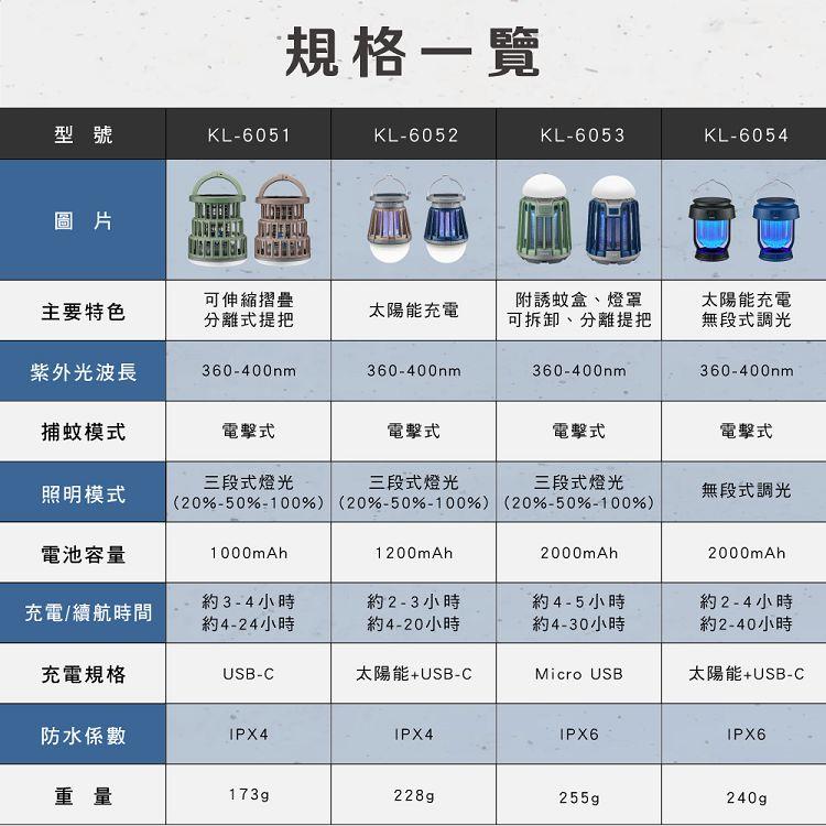 品名:無段式太陽能兩用捕蚊燈 型號:KL-6054 額定電壓/電流:DC 5V /1A 總額消耗電功率:5W 電擊電壓:≒1000V 電池容量:2000mAh 充電時間:約2-4小時 滿電續航時間:約2-40小時 ( 依使用模式而異) 使用燈源:LED燈珠X4(捕蚊燈)、LED燈珠X16(光源) 燈珠功率:0.06W 照明亮度:6-160LM 防水等級:IPX6 材質:PC塑膠+ABS塑膠 產品重量:240g±5% 產品尺寸:Φ100mm×125mm 包裝尺寸:W105XD105XH160 mm 配件:
