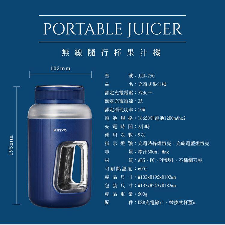 【KINYO】JRU-750BU 無線隨行杯果汁機 藍