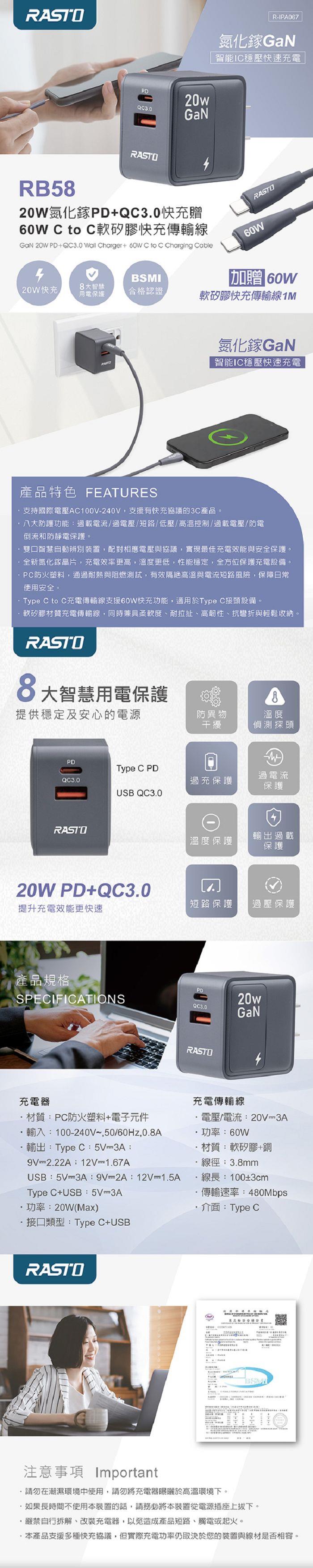 RASTO RB58 20W氮化鎵PD+QC3.0快充贈60W C to C軟矽膠快充傳輸線