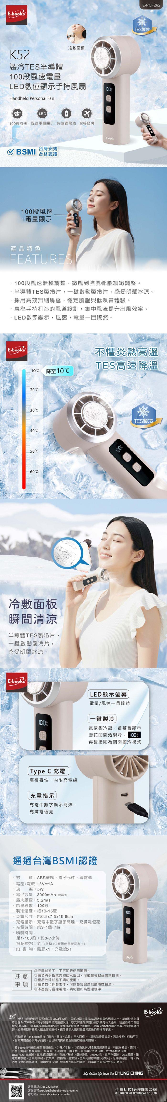 E-books K52 製冷TES半導體100段風速電量LED數位顯示手持風扇