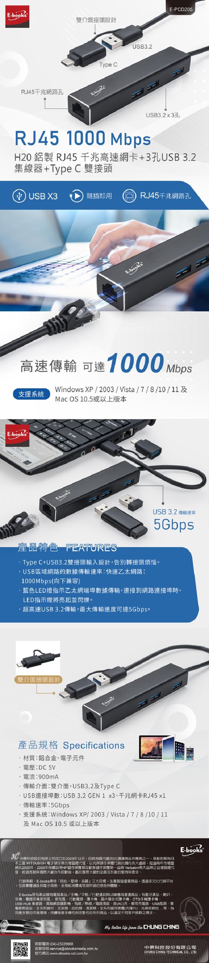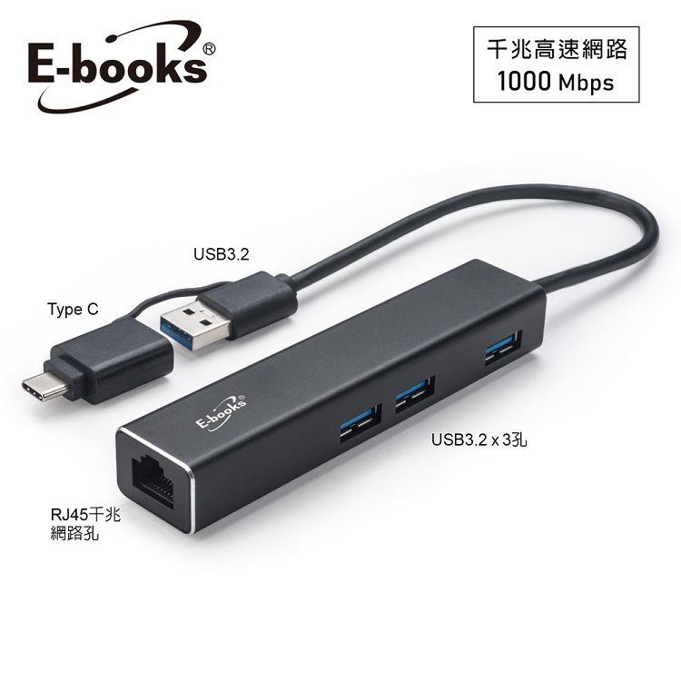 E-books H20 鋁製RJ45千兆高速網卡+3孔USB 3.2集線器+Type C雙接頭