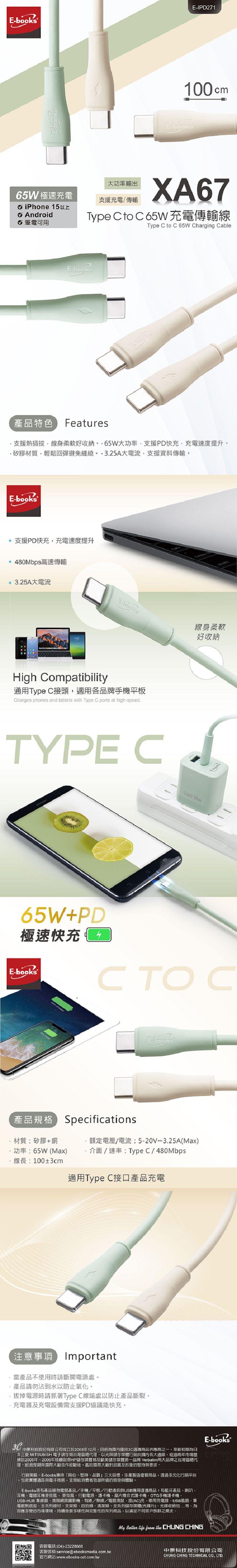 E-books XA67 Type C to C 65W充電傳輸線-綠
