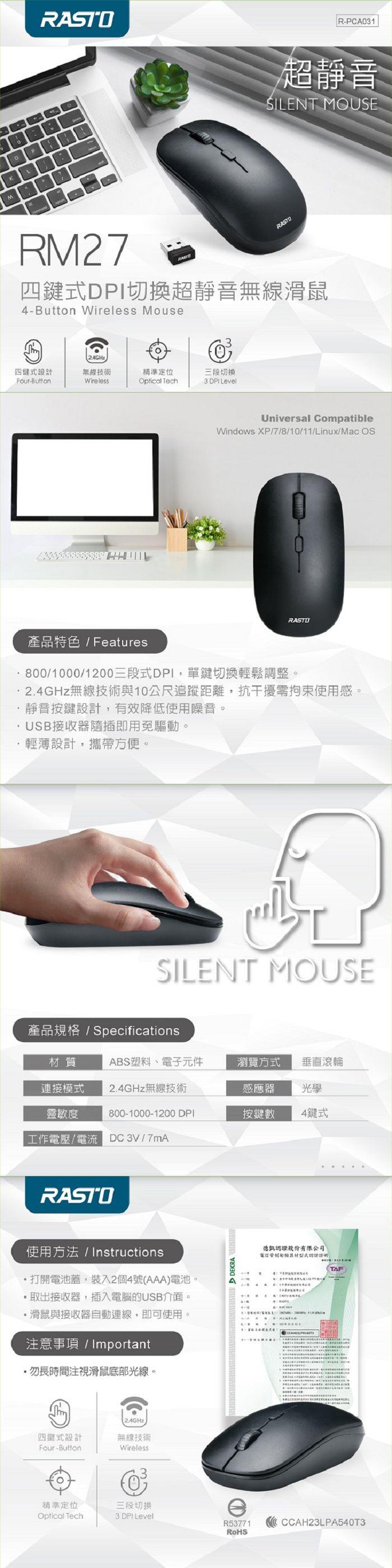 RASTO RM27四鍵式DPI切換超靜音無線滑鼠