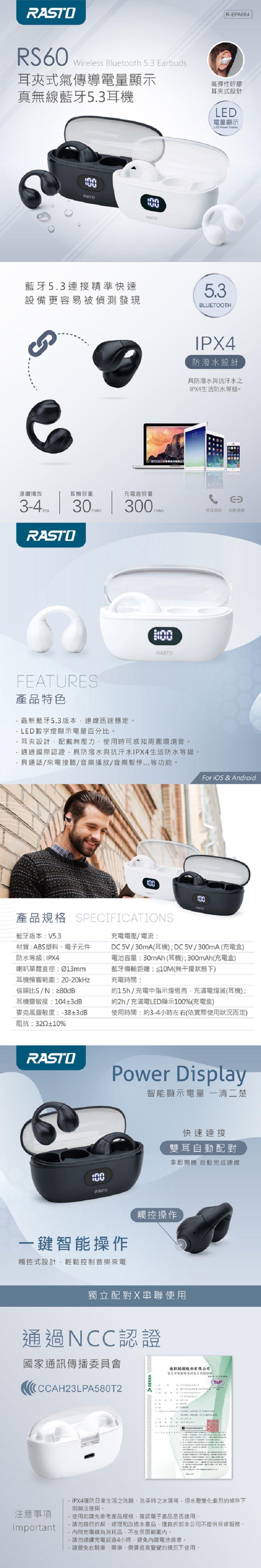 RASTO RS60 耳夾式氣傳導電量顯示真無線藍牙5.3耳機-白