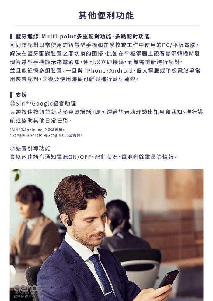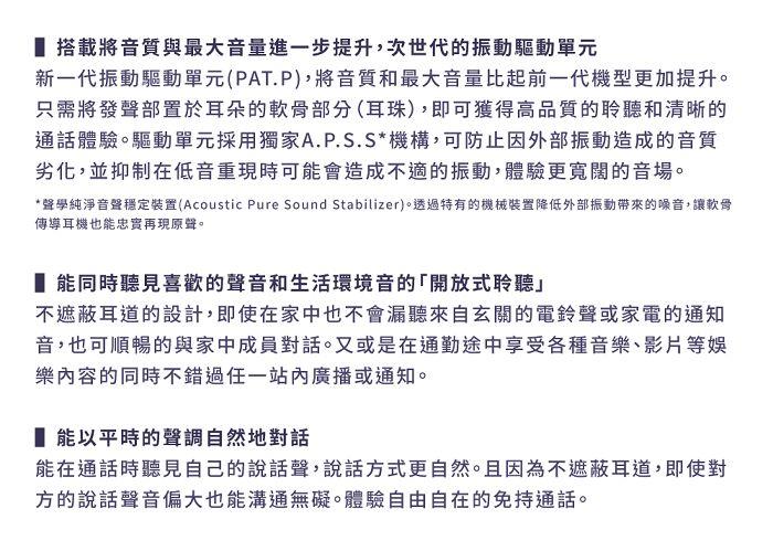 利用鐵三角專利的軟骨傳導,不用塞入耳道即可將聲音有效的傳至鼓膜
