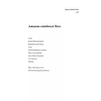 《森》與歷年創作不同,以往善於觀看城市形色事物,轉而至今發掘內心情感,也許暗藏自己眾多不敢提及的傷痕,但仍然必須堅忍面對現實殘酷。除了個人心理因素,詩集也收錄批判政治社會議題,亦包含已發表國外雜誌、網路平台的多首英文詩,其中以〈亞馬遜雨林之火〉(Amazon rainforest fires)最為醒目。〈亞馬遜雨林之火〉是2019年9月參與全球詩人「共同拯救地球」(LET'S SAVE THE PLANET)主題活動所發表的作品。當時正面臨亞馬遜雨林烈火侵襲,巴西政府漠視火災並姑息縱火行為,嗣後在各國媒體大肆報導,引發輿論譴責聲浪,這場雨林大火才開始備受重視。新聞報導引來詩人用行動關注環境議題,我馬上寫了此短詩,譯為英文,商請長期指導我中英翻譯的王清祿老師修正與發表,今年(2021)出版,才將詩收錄於最後一首。