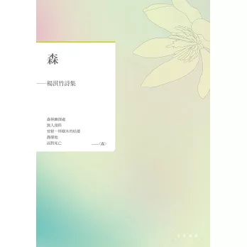詩人楊淇竹繼《生命佇留的,城與城》、《夏荷時節》詩集,再以《森》詩集闡述生命中的物換星移,不同時期的記憶片段或情緒萬縷,皆透過精煉的文字轉化為一篇篇詩作,進而永恆保存。另精選出二十首漢英詩作,冀望以不同語言,傳達出華語詩作的美麗與深刻。