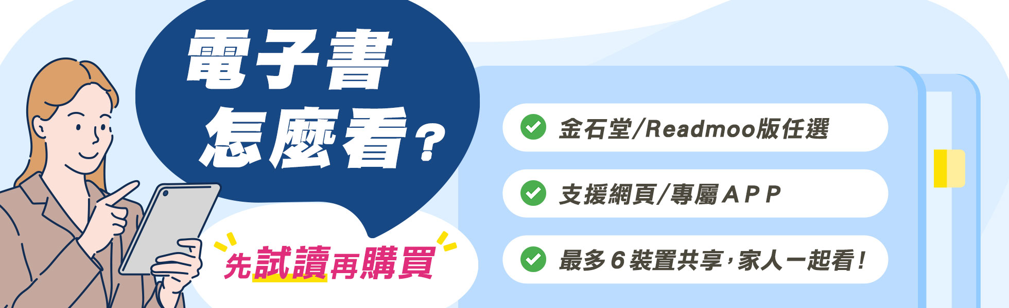 電子書分為「金石堂(線上閱讀+APP)」及「Readmoo(兌換碼)」兩種:
