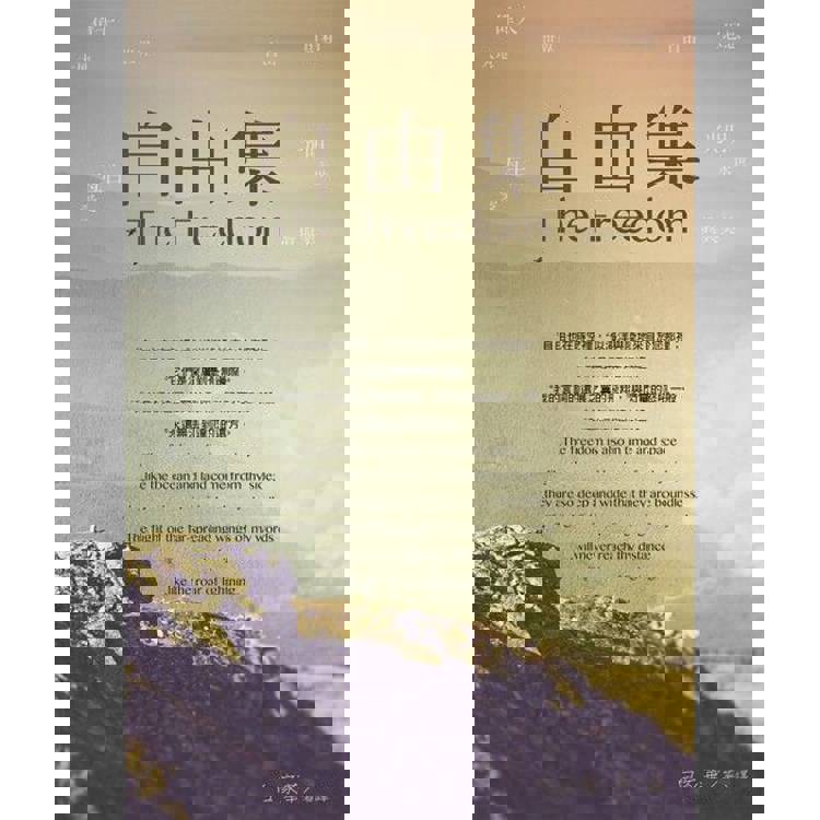 ◎53首中英對照詩,一本主流外、雙語創作的詩集面世了! ◎篇幅雖然薄、輕,但藝術性、獨創性、一貫性以及困難度的含金量極高。 ◎這是一場永世之旅,歲月的光輝裡有奮鬥的足跡,自身的美麗和不變的慈愛。 自由、世界、光明、大地、亙古、真與美、永世、偉大、愛、思想 Freedom、World、Light、Earth、Truth and Beauty、Eternity、Greatness、Love、Thought ⊃1;自由也在時空裡,⊃2;似海洋與陸地來自於您那裡;⊃3;它們是深廣到毫無邊際。⁴ 我的言詞的遠展之翼的飛翔,⁵與閃電的怒吼一般,⁶永遠無法到達您的遠方。 ₁The freedom is also in time and space ₂like the ocean and land come from thy side; ₃they are so deep and wide that they are boundless. ₄The flight of the far-spreading wings of my words ₅will never reach thy distance ₆like the roar of lightning. ⊃1;我尚且未能確切知曉,⊃2;自由來自何處, ⊃3;但您已給了我們那必要的自由,⁴以致腳能行走而翅能飛翔! ₁I still do not know exactly ₂where the freedom comes from, ₃but thou hast given the necessary freedom to us ₄so that the feet can walk and wings fly!