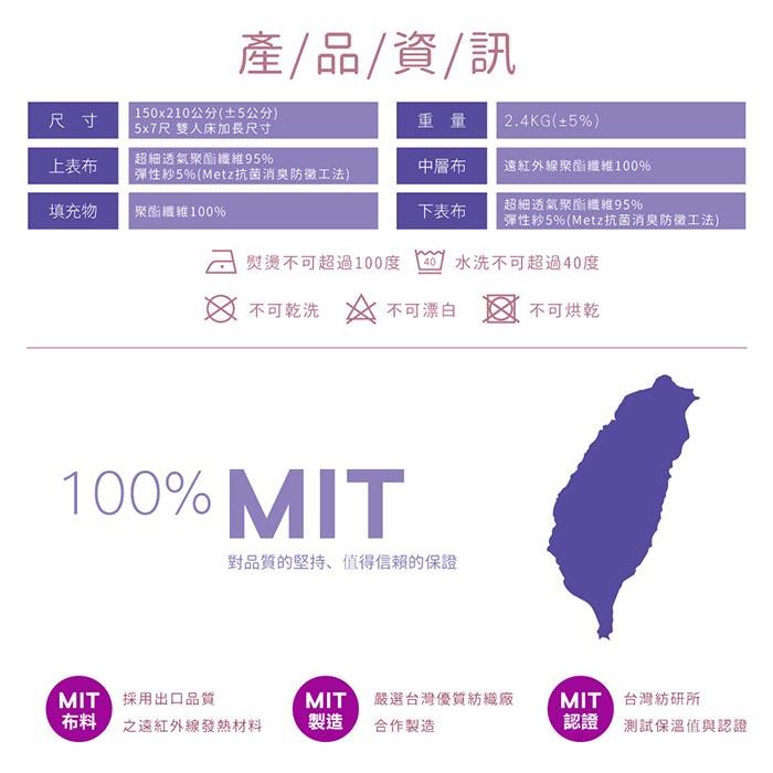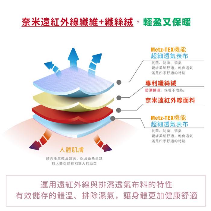 健康加值,遠紅外線能量可促進新陳代謝,遠紅外線防潮排濕健康發熱毯被,奈米遠紅外線健康四季被,有助於維持身體機能正常運作。
