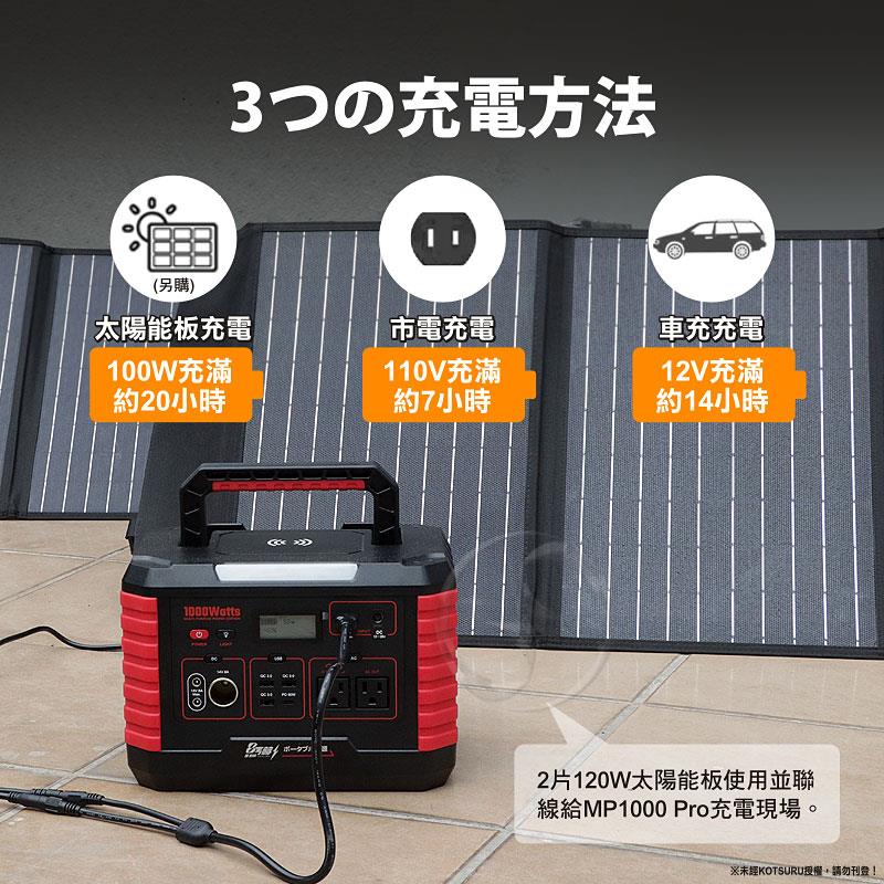 可以用太陽能板為儲能電源充電,但如果一次要使用2塊太陽能板一起充電,則需另購太陽能板並聯轉接線。(日本KOTSURU便攜式太陽能板60W/120W與太陽能板並聯轉接線都可另外選購!)