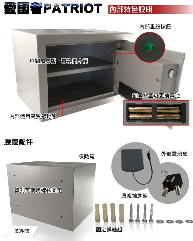 採電子機械化上鎖設計,可更改密碼,可設置警戒狀態,受到振動發佈警報,在緊急情況下可手動鑰匙開門,可選擇1-8位數字密碼設定,保險箱內鋪地毯免於文件或重要物品刮傷。時尚簡約的外觀、恆久耐用的品質,無論是飯店、辦公室、商店、一般家庭都適用,買了安心多個萬全保障。