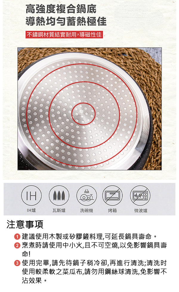 通過SGS檢驗合格使用安心,採用合金材質製造,不沾麥飯石塗層處理,不沾鍋身抗黏OK,不易粘黏食材,易清洗,傳熱快速,導熱更均勻,儲熱性佳,料理食物好鍋具,原木手柄握感極佳,IH電磁爐對應,適用瓦斯爐、電爐、陶瓷爐、紅外線爐,輕鬆創造行動廚房。