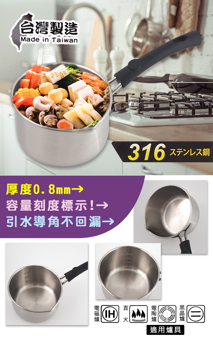▲鍋身採用316不鏽鋼材質 ▲耐磨耗耐酸鹼抗腐蝕更安全 ▲導熱迅速均勻儲熱性佳 ▲鍋身內外有容量刻度標示 ▲IH電磁爐適用