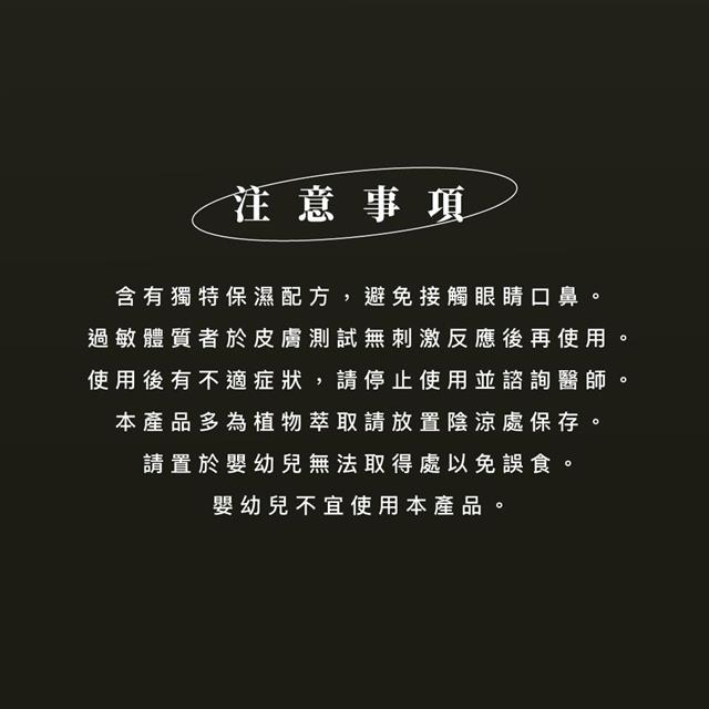 - 含有獨特保濕配方,避免接觸眼睛口鼻。懷孕,哺乳或正要懷孕者,請勿使用本產品。