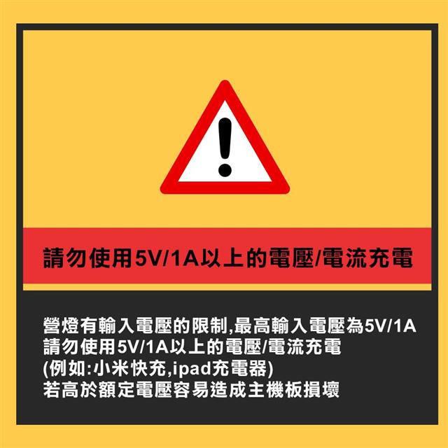 營燈有輸入電壓的限制,最高輸入電壓為5V/1A