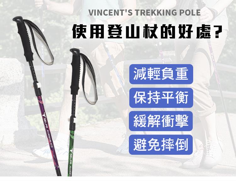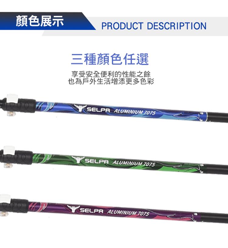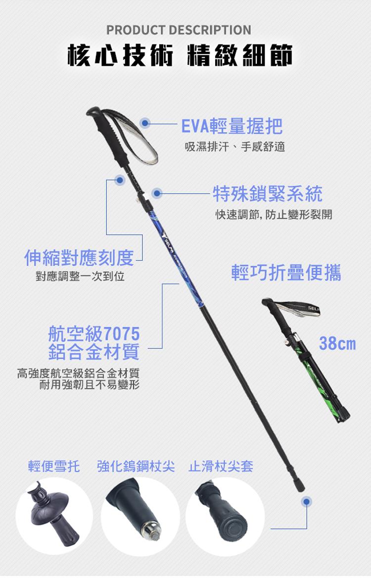 航太級7075鋁合金材質,特殊快速壓扣上鎖設計,高強度鎢鈷鈦合金杖尖