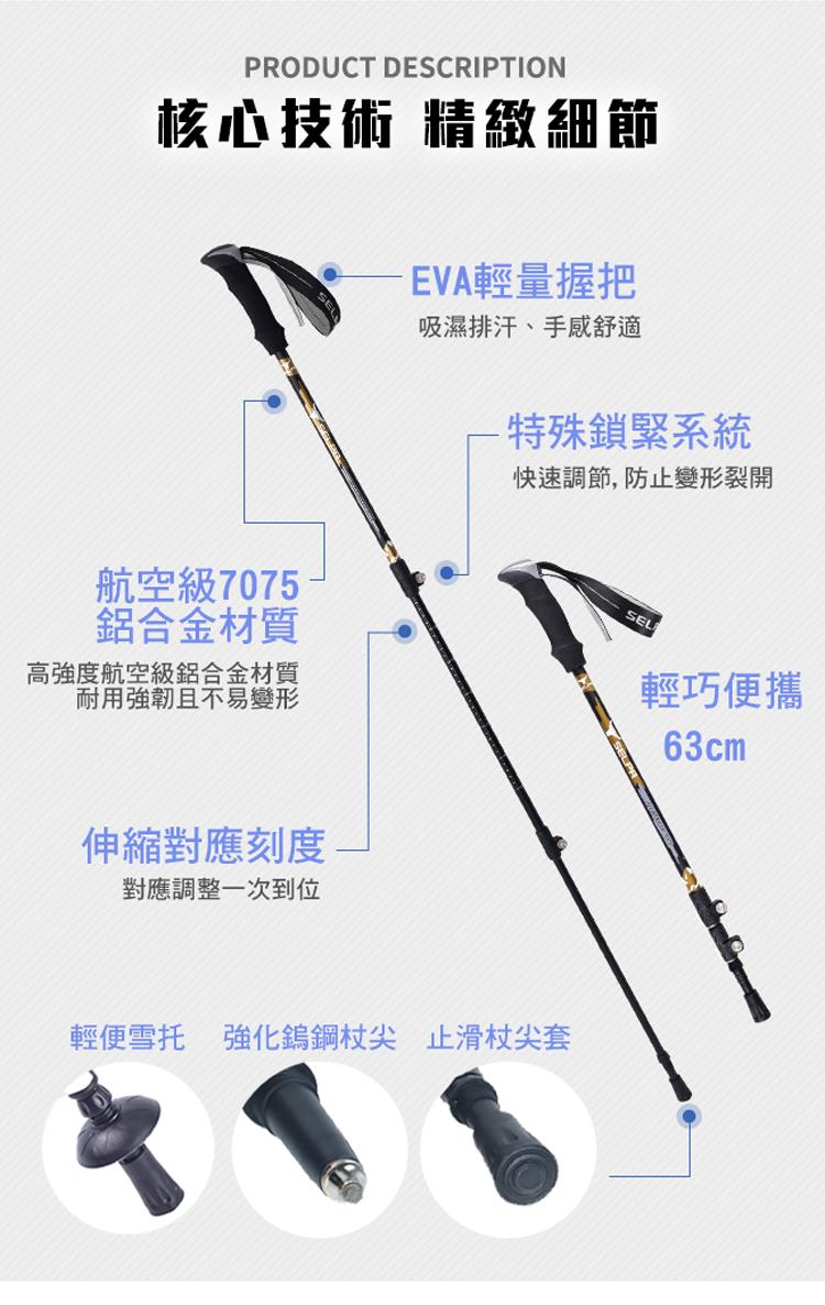 特殊快速壓扣上鎖設計,高強度鎢鈷鈦合金杖尖