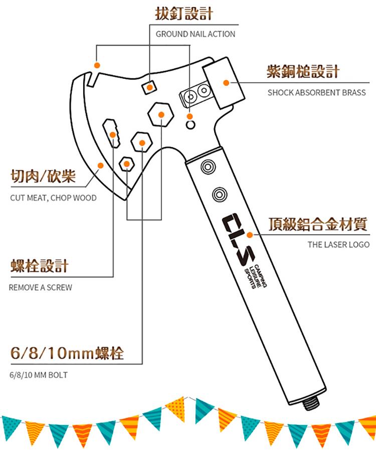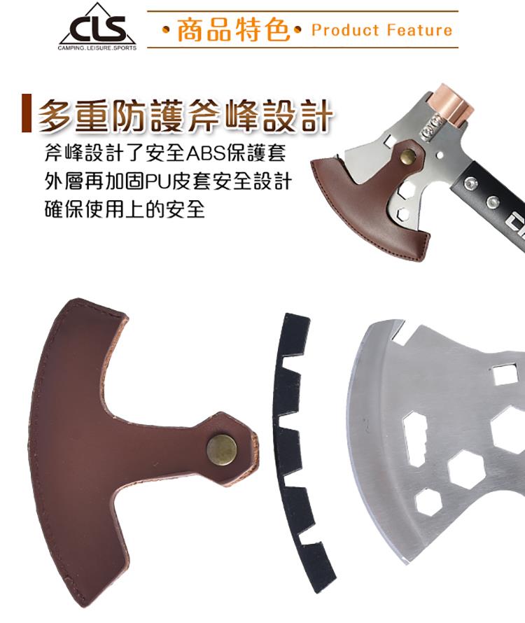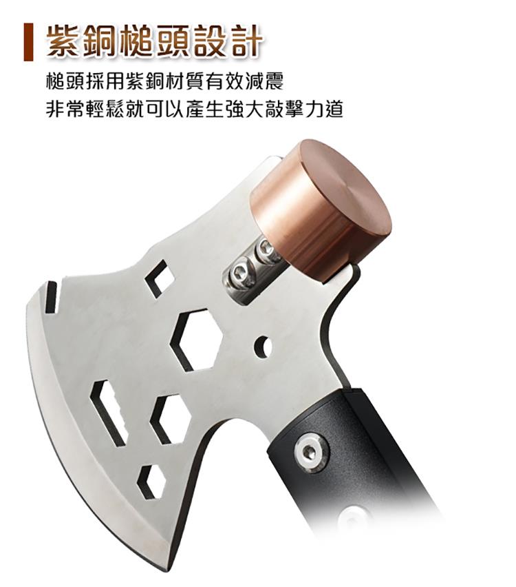 ◆紫銅槌頭設計◆多重防護斧峰設計◆貼心拔釘器與螺栓設計