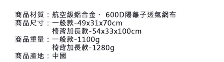 主要材質:航空級鋁合金,600D陽離子透氣網布
