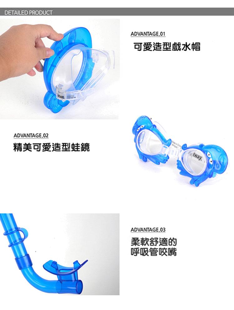 雙層寬邊結構防止滲漏,可愛造型戲水帽與蛙鏡,環保無毒pvc材質