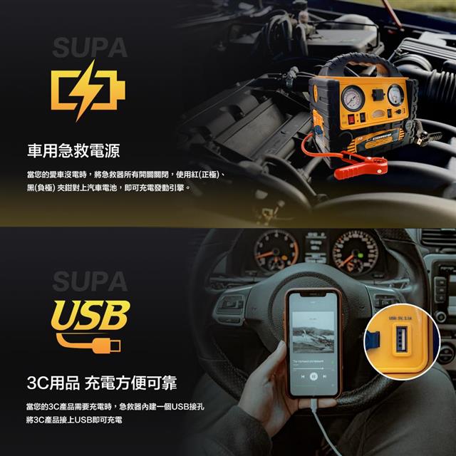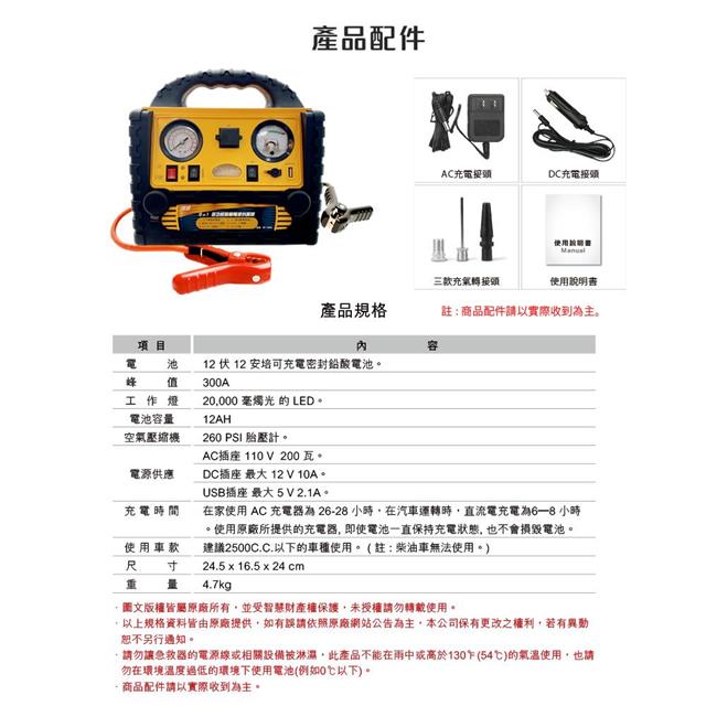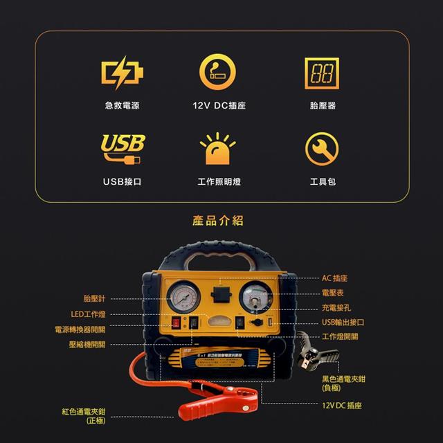 速霸BT-7688 六合一多功能電源供應器(家用AC110V/打氣機/12V電源供應/5V2.1A USB/LED緊急照明/汽車急救電源)