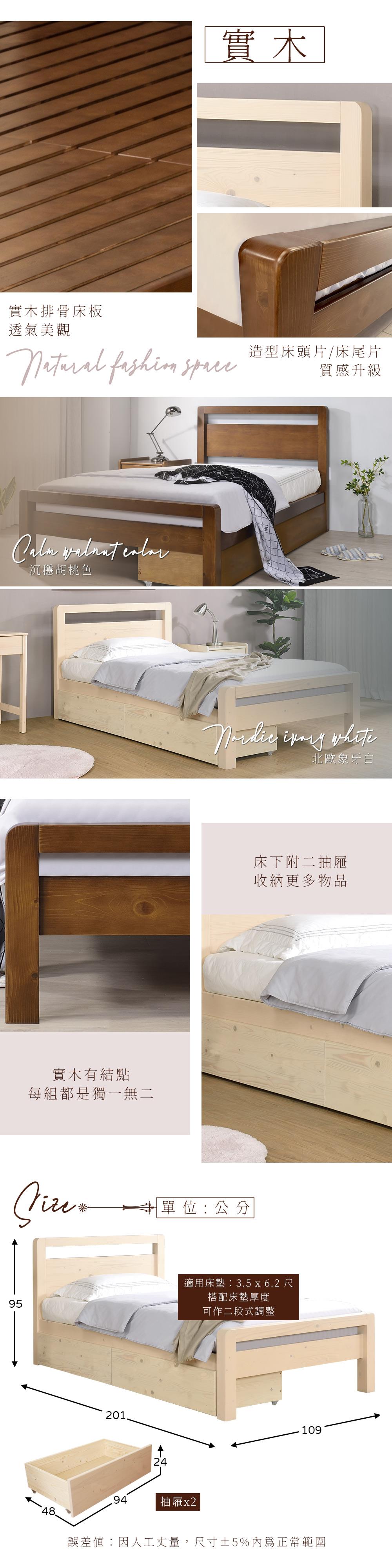 整體配件:3.5尺床架 x 1+床下抽屜x2 (不含床墊)