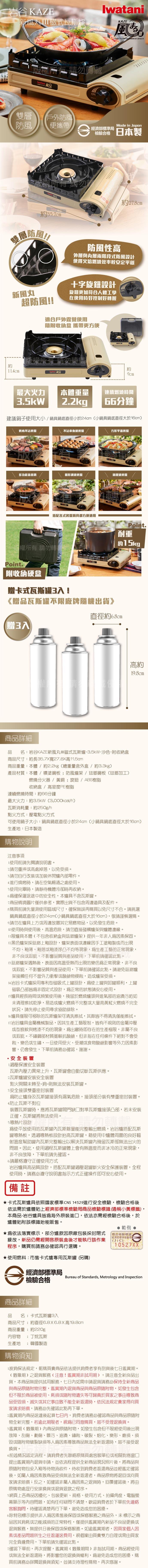 ★特殊防風裝置防風罩,穩定燃燒不受風力影響 ★壓力傳感安全裝置設計,氣瓶壓力過大或溫度異常將自動切斷 ★磁卡式裝卸瓦斯罐功能,輕鬆換裝瓦斯罐