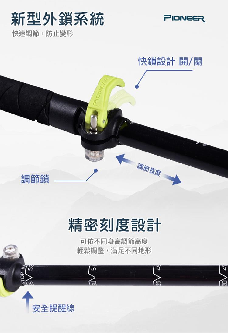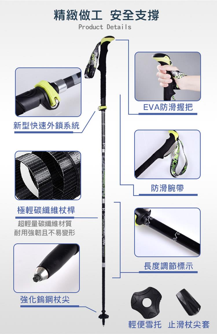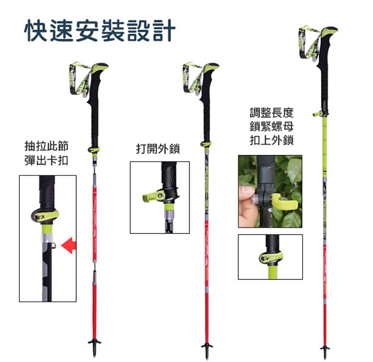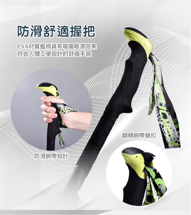 ▲舒適EVA握把 ▲安全鎖扣系統 ▲高強度鎢鋼杖尖