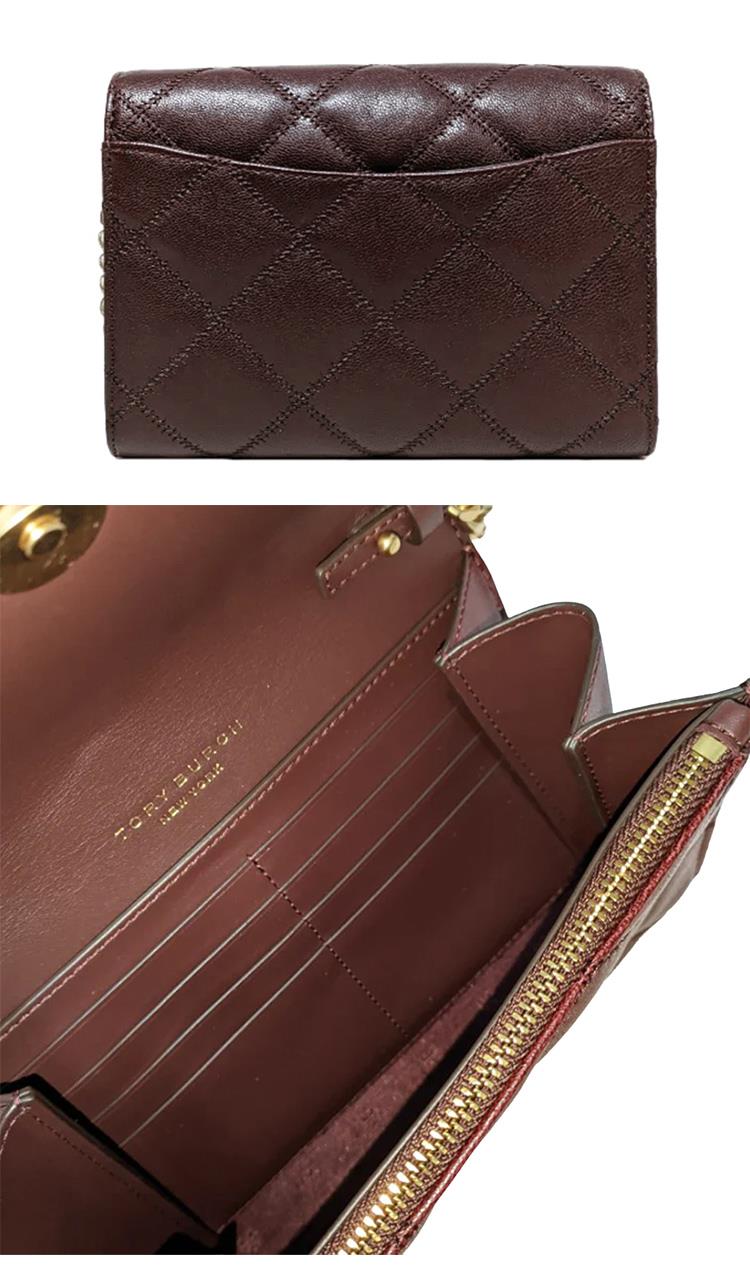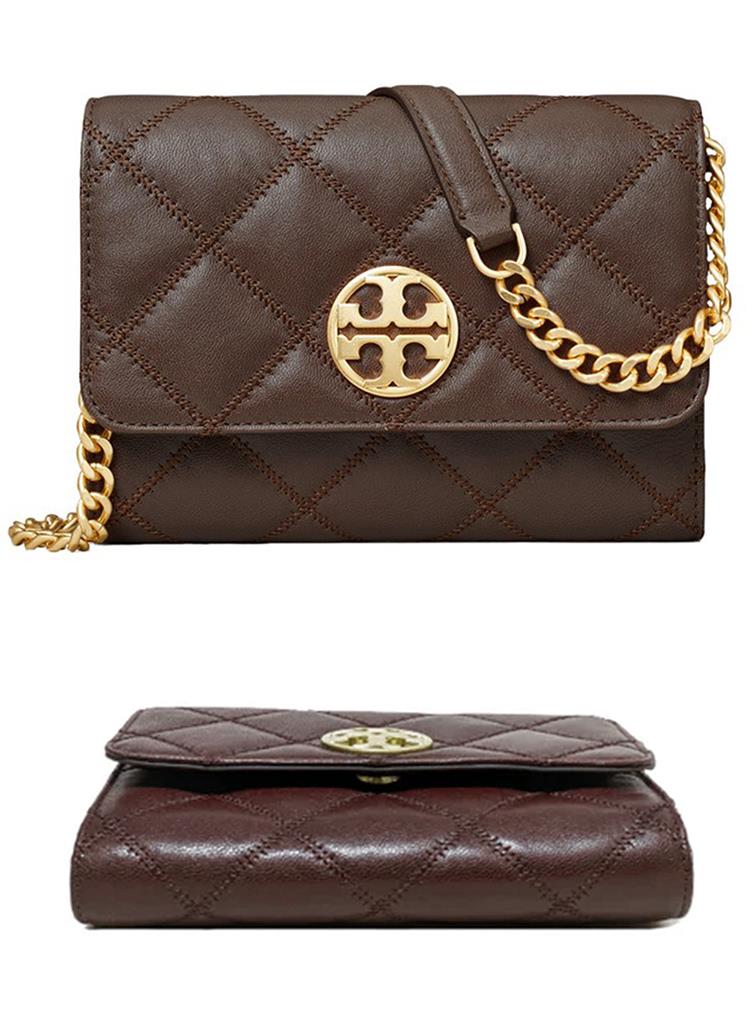 TORY BURCH 菱格紋皮革翻蓋斜背鍊包-棕色