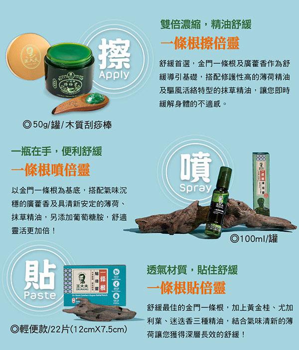 內容物:一條根擦倍靈油膏(50g)x1、一條根貼倍靈貼布(12cmx7.5cmx22入)x1、一條根噴倍靈(100ml)x1、手工木製刮痧棒x1